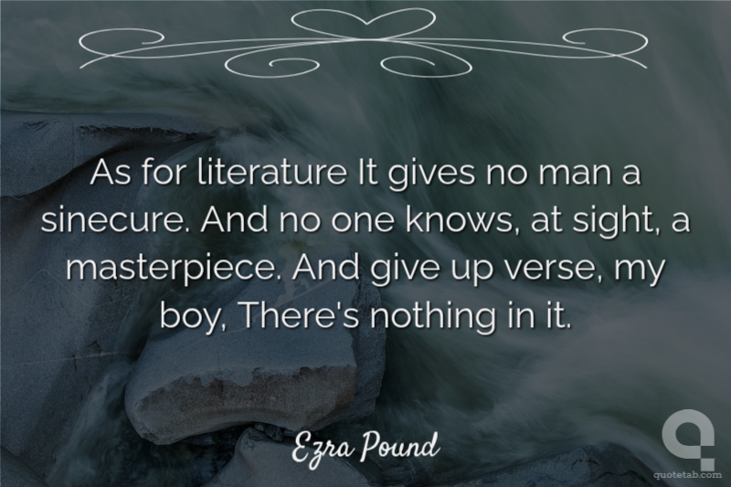 As for literature It gives no man a sinecure. And no one knows, at sight, a masterpiece. And give up verse, my boy, There's nothing in it.