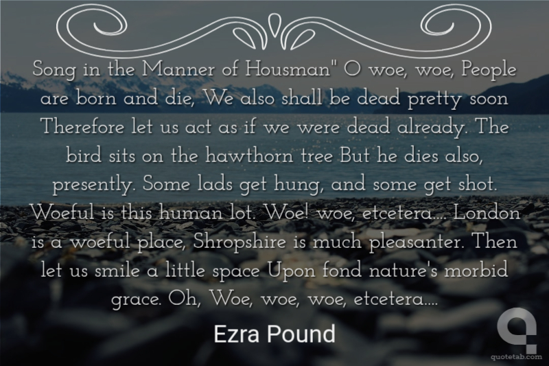 Song in the Manner of Housman" O woe, woe, People are born and die, We also shall be dead pretty soon Therefore let us act as if we were dead already. The bird sits on the hawthorn tree But he dies also, presently. Some lads get hung, and some get shot. Woeful is this human lot. Woe! woe, etcetera.... London is a woeful place, Shropshire is much pleasanter. Then let us smile a little space Upon fond nature's morbid grace. Oh, Woe, woe, woe, etcetera....