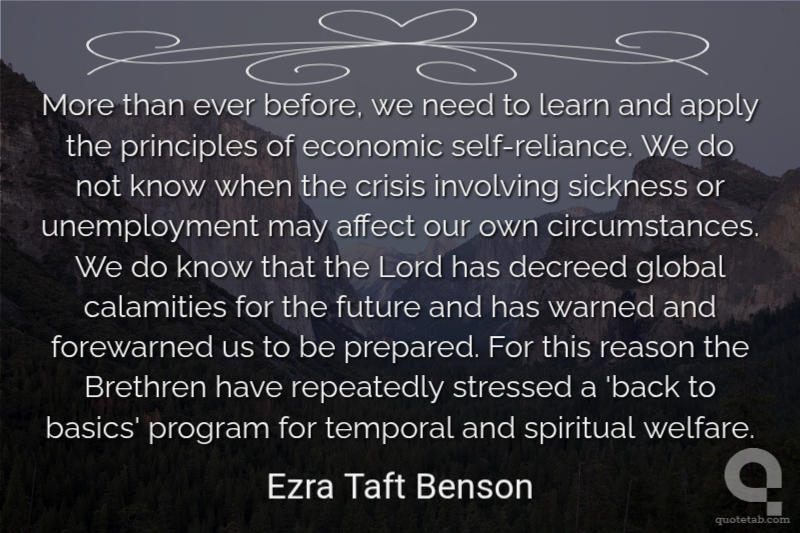 More than ever before, we need to learn and apply the principles of economic self-reliance. We do not know when the crisis involving sickness or unemployment may affect our own circumstances. We do know that the Lord has decreed global calamities for the future and has warned and forewarned us to be prepared. For this reason the Brethren have repeatedly stressed a 'back to basics' program for temporal and spiritual welfare.