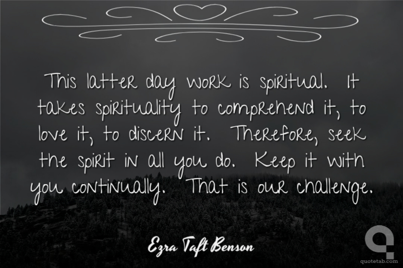 This latter day work is spiritual. It takes spirituality to comprehend it, to love it, to discern it. Therefore, seek the spirit in all you do. Keep it with you continually. That is our challenge.