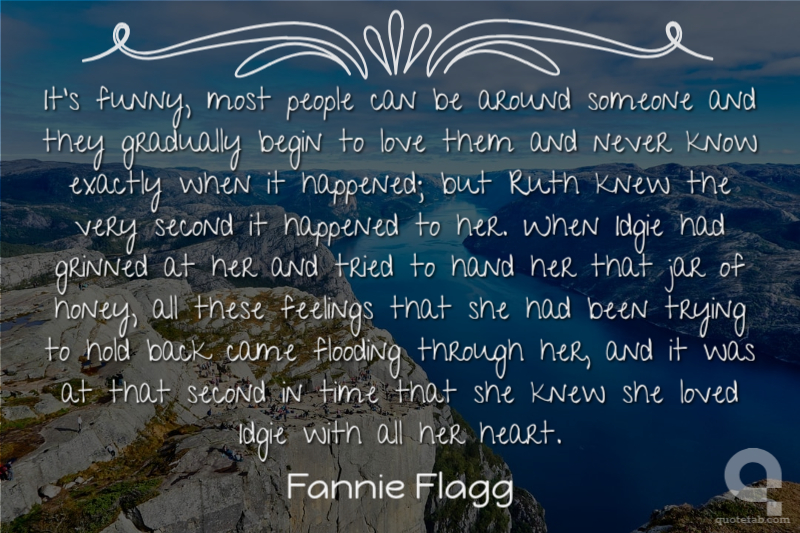 It's funny, most people can be around someone and they gradually begin to love them and never know exactly when it happened; but Ruth knew the very second it happened to her. When Idgie had grinned at her and tried to hand her that jar of honey, all these feelings that she had been trying to hold back came flooding through her, and it was at that second in time that she knew she loved Idgie with all her heart.