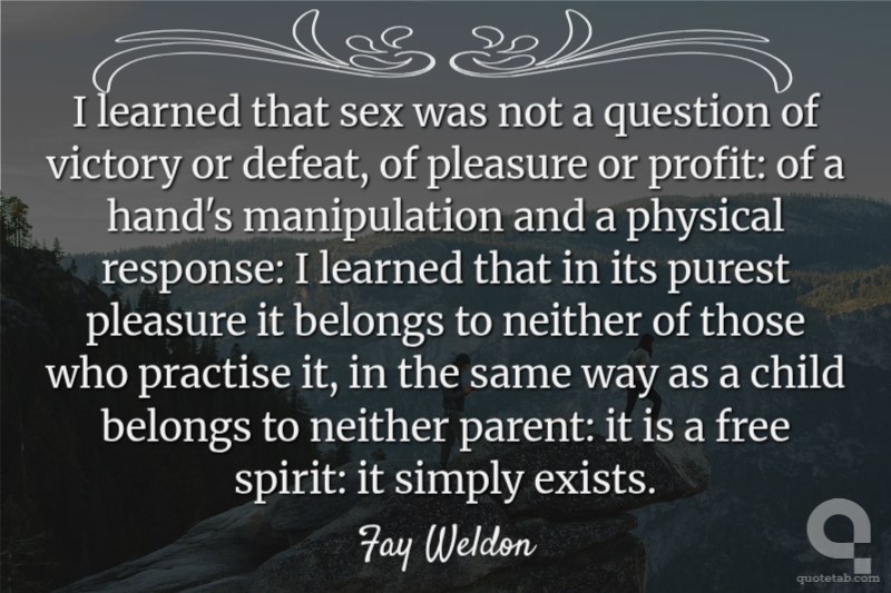 I learned that sex was not a question of victory or defeat, of pleasure or profit: of a hand's manipulation and a physical response: I learned that in its purest pleasure it belongs to neither of those who practise it, in the same way as a child belongs to neither parent: it is a free spirit: it simply exists.