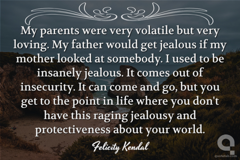 My parents were very volatile but very loving. My father would get jealous if my mother looked at somebody. I used to be insanely jealous. It comes out of insecurity. It can come and go, but you get to the point in life where you don't have this raging jealousy and protectiveness about your world.