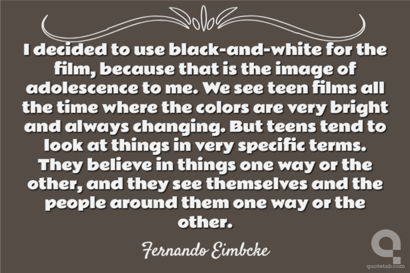 I decided to use black-and-white for the film, because that is the image of adolescence to me. We see teen films all the time where the colors are very bright and always changing. But teens tend to look at things in very specific terms. They believe in things one way or the other, and they see themselves and the people around them one way or the other.