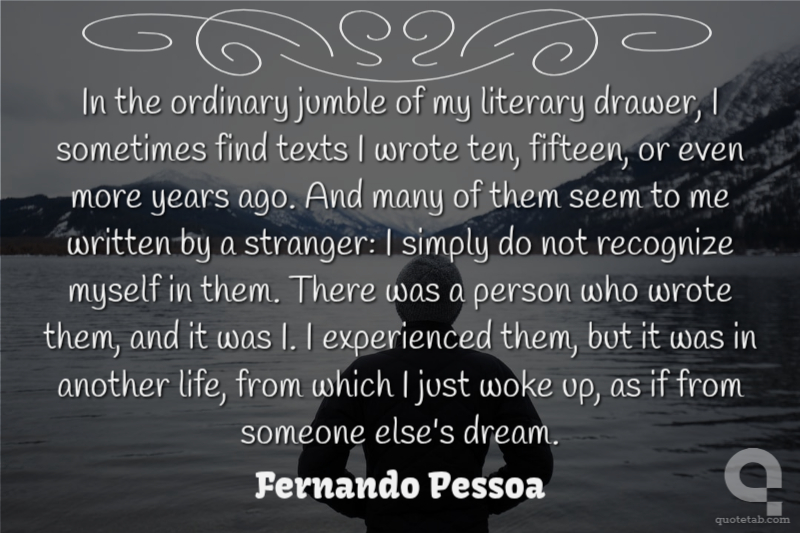 In the ordinary jumble of my literary drawer, I sometimes find texts I wrote ten, fifteen, or even more years ago. And many of them seem to me written by a stranger: I simply do not recognize myself in them. There was a person who wrote them, and it was I. I experienced them, but it was in another life, from which I just woke up, as if from someone else's dream.