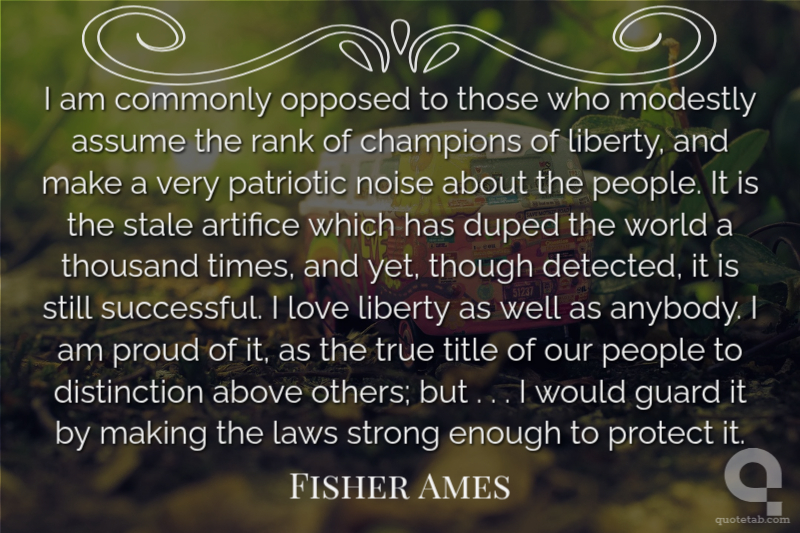 I am commonly opposed to those who modestly assume the rank of champions of liberty, and make a very patriotic noise about the people. It is the stale artifice which has duped the world a thousand times, and yet, though detected, it is still successful. I love liberty as well as anybody. I am proud of it, as the true title of our people to distinction above others; but . . . I would guard it by making the laws strong enough to protect it.