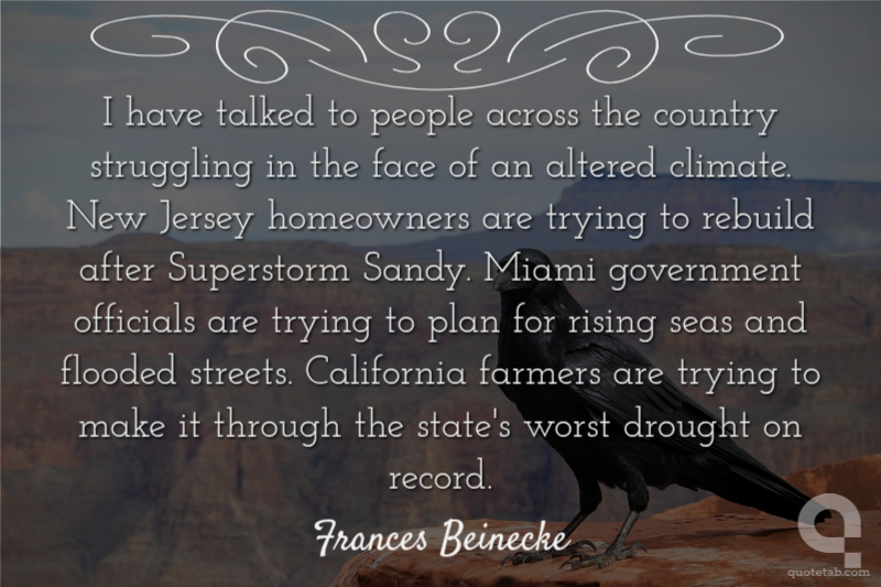 I have talked to people across the country struggling in the face of an altered climate. New Jersey homeowners are trying to rebuild after Superstorm Sandy. Miami government officials are trying to plan for rising seas and flooded streets. California farmers are trying to make it through the state's worst drought on record.