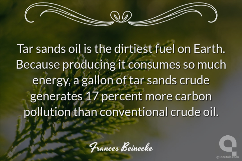 Tar sands oil is the dirtiest fuel on Earth. Because producing it consumes so much energy, a gallon of tar sands crude generates 17 percent more carbon pollution than conventional crude oil.