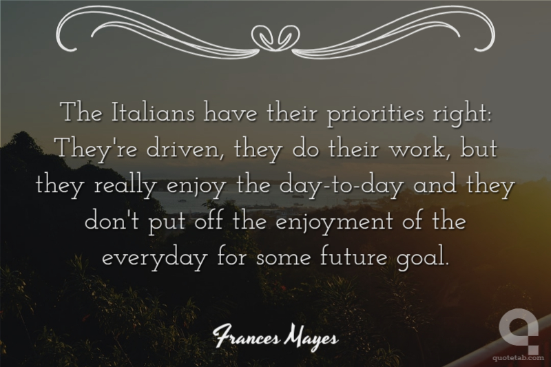 The Italians have their priorities right: They're driven, they do their work, but they really enjoy the day-to-day and they don't put off the enjoyment of the everyday for some future goal.