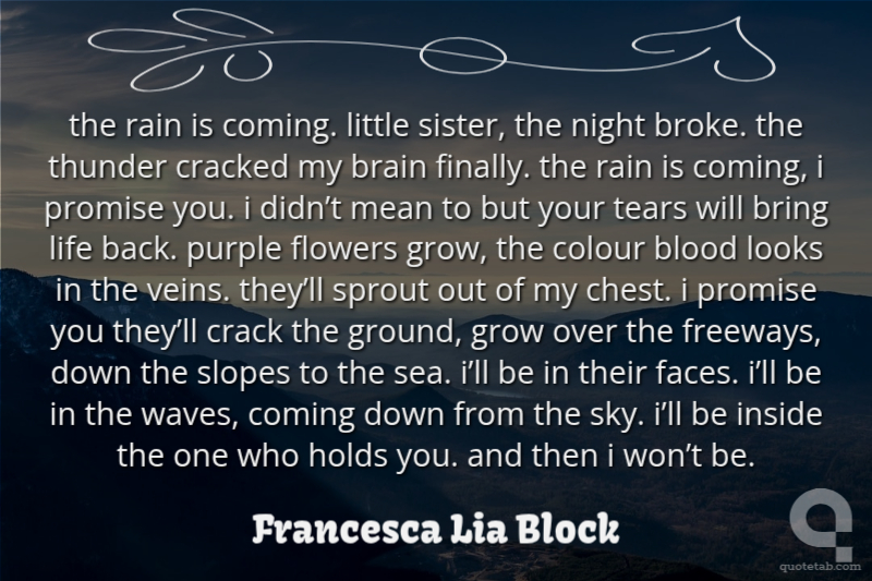 the rain is coming. little sister, the night broke. the thunder cracked my brain finally. the rain is coming, i promise you. i didn’t mean to but your tears will bring life back. purple flowers grow, the colour blood looks in the veins. they’ll sprout out of my chest. i promise you they’ll crack the ground, grow over the freeways, down the slopes to the sea. i’ll be in their faces. i’ll be in the waves, coming down from the sky. i’ll be inside the one who holds you. and then i won’t be.