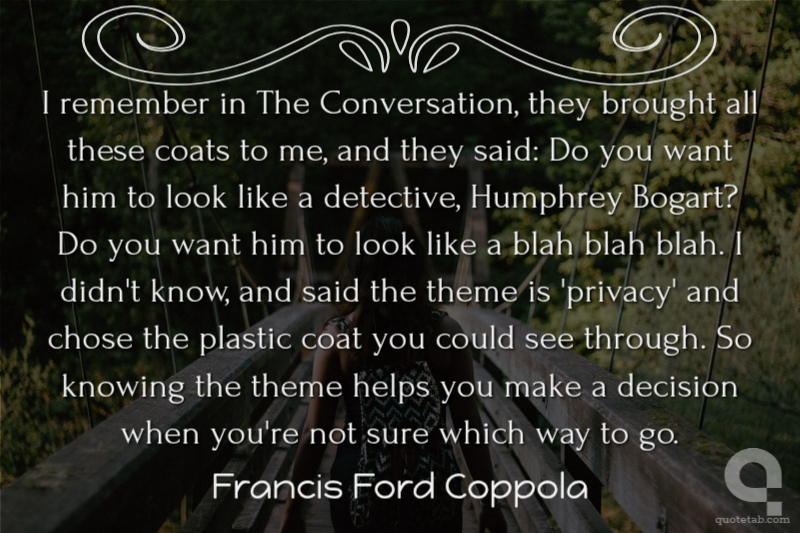 I remember in The Conversation, they brought all these coats to me, and they said: Do you want him to look like a detective, Humphrey Bogart? Do you want him to look like a blah blah blah. I didn't know, and said the theme is 'privacy' and chose the plastic coat you could see through. So knowing the theme helps you make a decision when you're not sure which way to go.