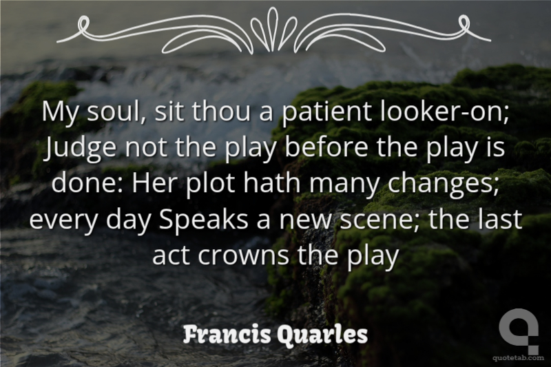 My soul, sit thou a patient looker-on; Judge not the play before the play is done: Her plot hath many changes; every day Speaks a new scene; the last act crowns the play