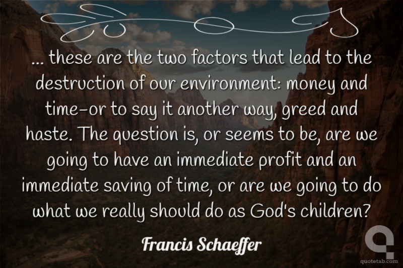 ... these are the two factors that lead to the destruction of our environment: money and time-or to say it another way, greed and haste. The question is, or seems to be, are we going to have an immediate profit and an immediate saving of time, or are we going to do what we really should do as God's children?