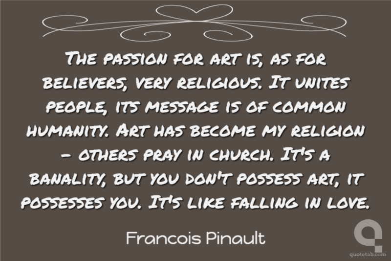 The passion for art is, as for believers, very religious. It unites people, its message is of common humanity. Art has become my religion - others pray in church. It's a banality, but you don't possess art, it possesses you. It's like falling in love.