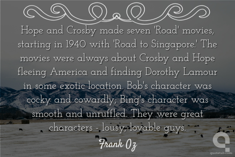 Hope and Crosby made seven 'Road' movies, starting in 1940 with 'Road to Singapore.' The movies were always about Crosby and Hope fleeing America and finding Dorothy Lamour in some exotic location. Bob's character was cocky and cowardly; Bing's character was smooth and unruffled. They were great characters - lousy, lovable guys.