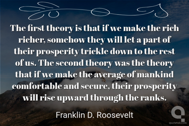 The first theory is that if we make the rich richer, somehow they will let a part of their prosperity trickle down to the rest of us. The second theory was the theory that if we make the average of mankind comfortable and secure, their prosperity will rise upward through the ranks.