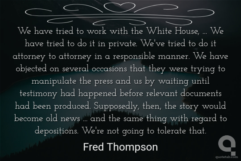 We have tried to work with the White House, ... We have tried to do it in private. We've tried to do it attorney to attorney in a responsible manner. We have objected on several occasions that they were trying to manipulate the press and us by waiting until testimony had happened before relevant documents had been produced. Supposedly, then, the story would become old news ... and the same thing with regard to depositions. We're not going to tolerate that.