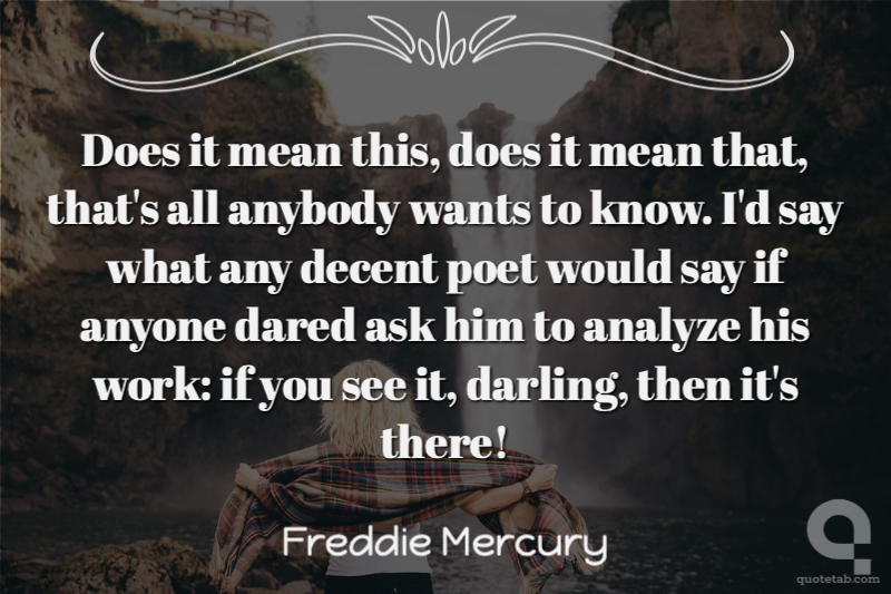 Does it mean this, does it mean that, that's all anybody wants to know. I'd say what any decent poet would say if anyone dared ask him to analyze his work: if you see it, darling, then it's there!