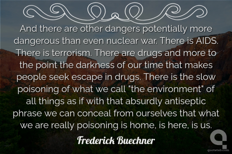 And there are other dangers potentially more dangerous than even nuclear war. There is AIDS. There is terrorism. There are drugs and more to the point the darkness of our time that makes people seek escape in drugs. There is the slow poisoning of what we call "the environment" of all things as if with that absurdly antiseptic phrase we can conceal from ourselves that what we are really poisoning is home, is here, is us.