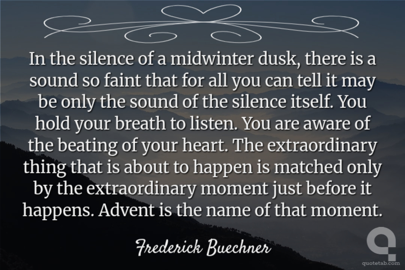 In the silence of a midwinter dusk, there is a sound so faint that for all you can tell it may be only the sound of the silence itself. You hold your breath to listen. You are aware of the beating of your heart. The extraordinary thing that is about to happen is matched only by the extraordinary moment just before it happens. Advent is the name of that moment.