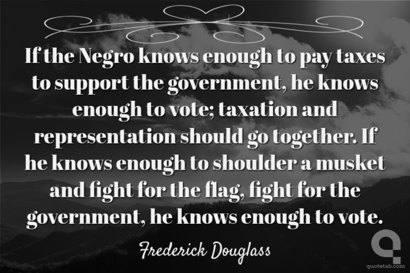 If the Negro knows enough to pay taxes to support the government, he knows enough to vote; taxation and representation should go together. If he knows enough to shoulder a musket and fight for the flag, fight for the government, he knows enough to vote.