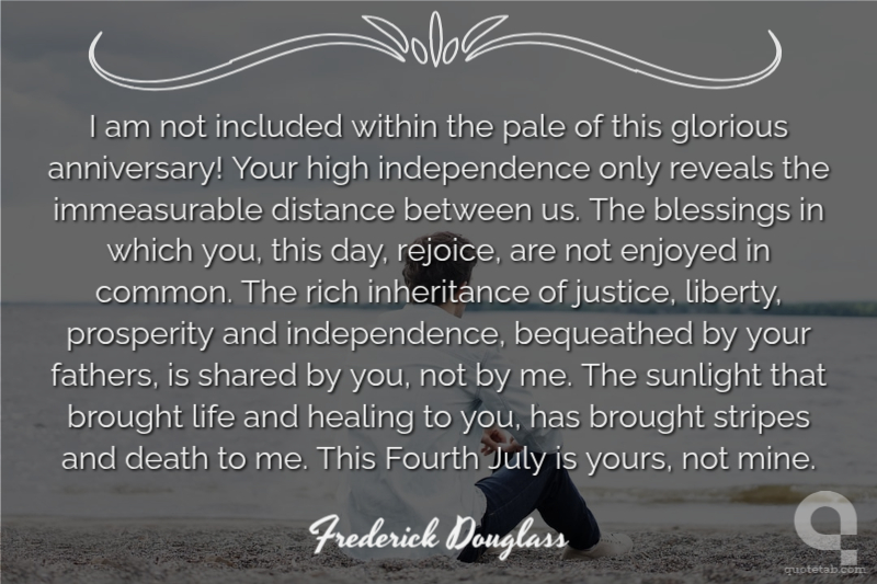 I am not included within the pale of this glorious anniversary! Your high independence only reveals the immeasurable distance between us. The blessings in which you, this day, rejoice, are not enjoyed in common. The rich inheritance of justice, liberty, prosperity and independence, bequeathed by your fathers, is shared by you, not by me. The sunlight that brought life and healing to you, has brought stripes and death to me. This Fourth July is yours, not mine.