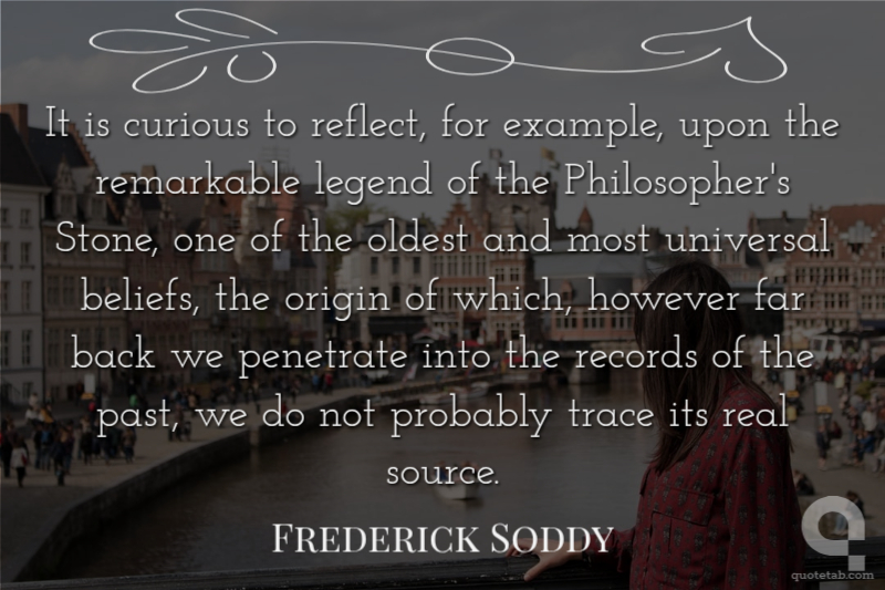 It is curious to reflect, for example, upon the remarkable legend of the Philosopher's Stone, one of the oldest and most universal beliefs, the origin of which, however far back we penetrate into the records of the past, we do not probably trace its real source.