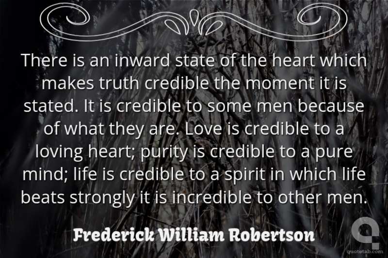There is an inward state of the heart which makes truth credible the moment it is stated. It is credible to some men because of what they are. Love is credible to a loving heart; purity is credible to a pure mind; life is credible to a spirit in which life beats strongly it is incredible to other men.