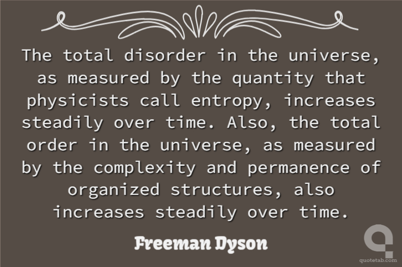 The total disorder in the universe, as measured by the quantity that physicists call entropy, increases steadily over time. Also, the total order in the universe, as measured by the complexity and permanence of organized structures, also increases steadily over time.