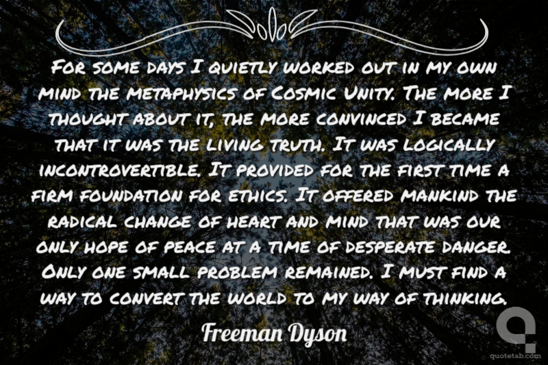 For some days I quietly worked out in my own mind the metaphysics of Cosmic Unity. The more I thought about it, the more convinced I became that it was the living truth. It was logically incontrovertible. It provided for the first time a firm foundation for ethics. It offered mankind the radical change of heart and mind that was our only hope of peace at a time of desperate danger. Only one small problem remained. I must find a way to convert the world to my way of thinking.
