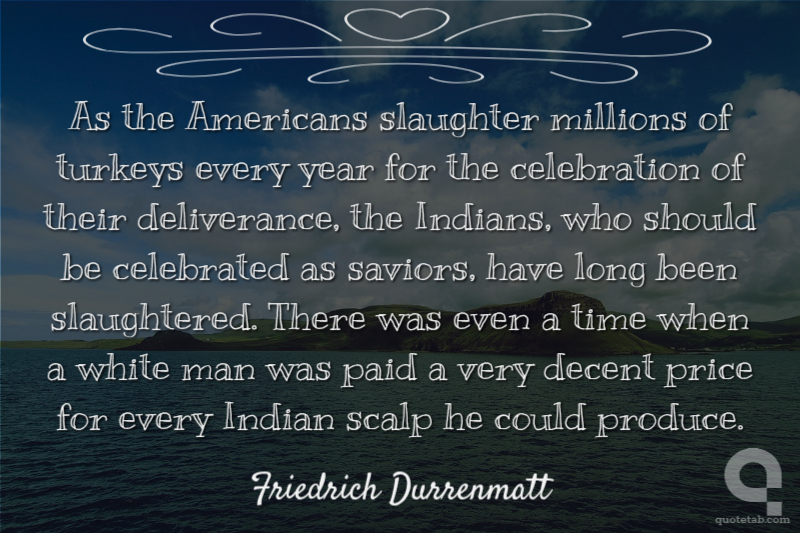 As the Americans slaughter millions of turkeys every year for the celebration of their deliverance, the Indians, who should be celebrated as saviors, have long been slaughtered. There was even a time when a white man was paid a very decent price for every Indian scalp he could produce.
