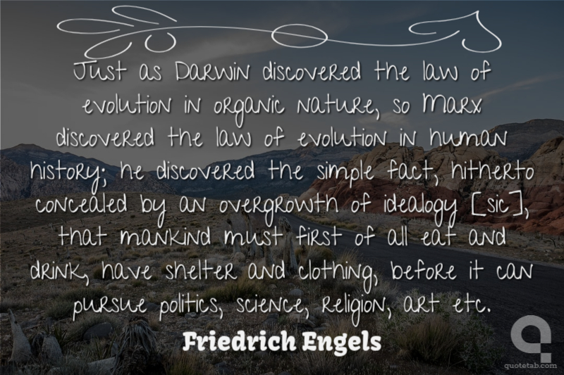Just as Darwin discovered the law of evolution in organic nature, so Marx discovered the law of evolution in human history; he discovered the simple fact, hitherto concealed by an overgrowth of idealogy [sic], that mankind must first of all eat and drink, have shelter and clothing, before it can pursue politics, science, religion, art etc.