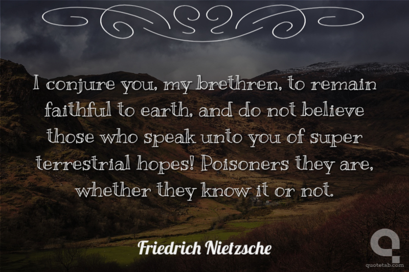 I conjure you, my brethren, to remain faithful to earth, and do not believe those who speak unto you of super terrestrial hopes! Poisoners they are, whether they know it or not.