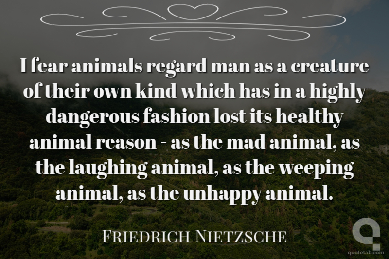 I fear animals regard man as a creature of their own kind which has in a highly dangerous fashion lost its healthy animal reason - as the mad animal, as the laughing animal, as the weeping animal, as the unhappy animal.