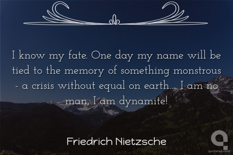 I know my fate. One day my name will be associated with the memory of something tremendous — a crisis without equal on earth, the most profound collision of conscience, a decision that was conjured up against everything that had been believed, demanded, hallowed so far. I am no man, I am dynamite.