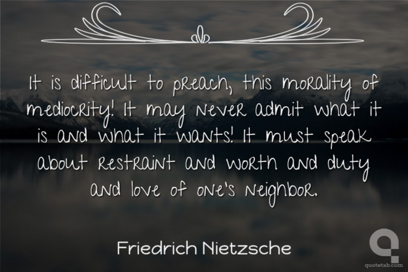 It is difficult to preach, this morality of mediocrity! It may never admit what it is and what it wants! It must speak about restraint and worth and duty and love of one's neighbor.