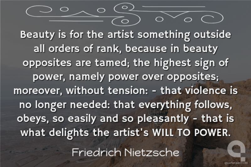 Beauty is for the artist something outside all orders of rank, because in beauty opposites are tamed; the highest sign of power, namely power over opposites; moreover, without tension: - that violence is no longer needed: that everything follows, obeys, so easily and so pleasantly - that is what delights the artist's WILL TO POWER.