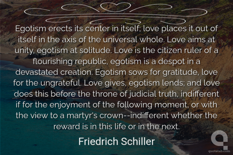 Egotism erects its center in itself; love places it out of itself in the axis of the universal whole. Love aims at unity, egotism at solitude. Love is the citizen ruler of a flourishing republic, egotism is a despot in a devastated creation. Egotism sows for gratitude, love for the ungrateful. Love gives, egotism lends; and love does this before the throne of judicial truth, indifferent if for the enjoyment of the following moment, or with the view to a martyr's crown--indifferent whether the reward is in this life or in the next.