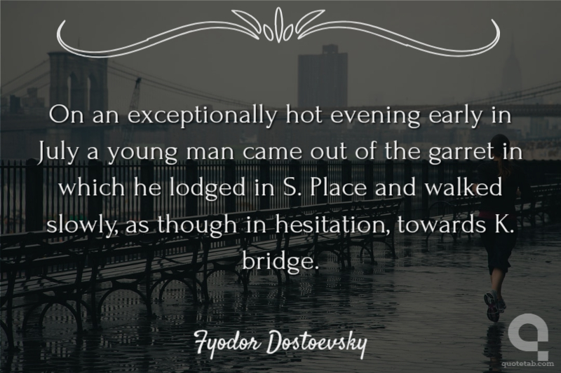 On an exceptionally hot evening early in July a young man came out of the garret in which he lodged in S. Place and walked slowly, as though in hesitation, towards K. bridge.