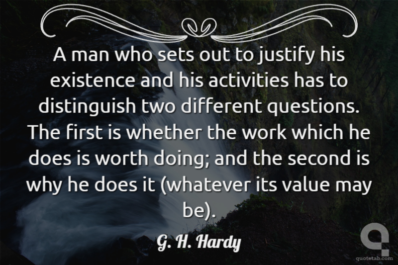 A man who sets out to justify his existence and his activities has to distinguish two different questions. The first is whether the work which he does is worth doing; and the second is why he does it (whatever its value may be).