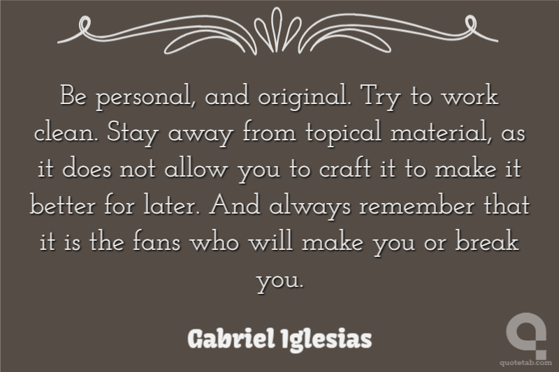 Be personal, and original. Try to work clean. Stay away from topical material, as it does not allow you to craft it to make it better for later. And always remember that it is the fans who will make you or break you.