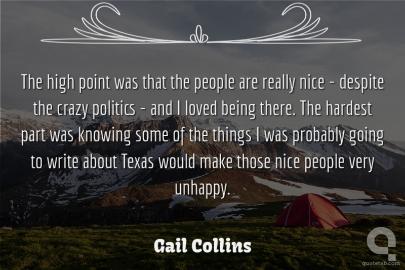 The high point was that the people are really nice - despite the crazy politics - and I loved being there. The hardest part was knowing some of the things I was probably going to write about Texas would make those nice people very unhappy.