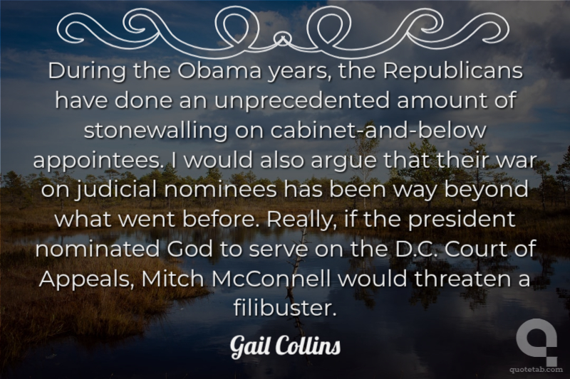 During the Obama years, the Republicans have done an unprecedented amount of stonewalling on cabinet-and-below appointees. I would also argue that their war on judicial nominees has been way beyond what went before. Really, if the president nominated God to serve on the D.C. Court of Appeals, Mitch McConnell would threaten a filibuster.