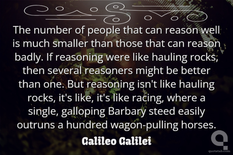 The number of people that can reason well is much smaller than those that can reason badly. If reasoning were like hauling rocks, then several reasoners might be better than one. But reasoning isn't like hauling rocks, it's like, it's like racing, where a single, galloping Barbary steed easily outruns a hundred wagon-pulling horses.