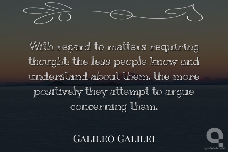 Long experience has taught me this about the status of mankind with regard to matters requiring thought: the less people know and understand about them, the more positively they attempt to argue concerning them, while on the other hand to know and understand a multitude of things renders men cautious in passing judgment upon anything new.