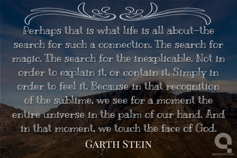 Perhaps that is what life is all about—the search for such a connection. The search for magic. The search for the inexplicable. Not in order to explain it, or contain it. Simply in order to feel it. Because in that recognition of the sublime, we see for a moment the entire universe in the palm of our hand. And in that moment, we touch the face of God.
