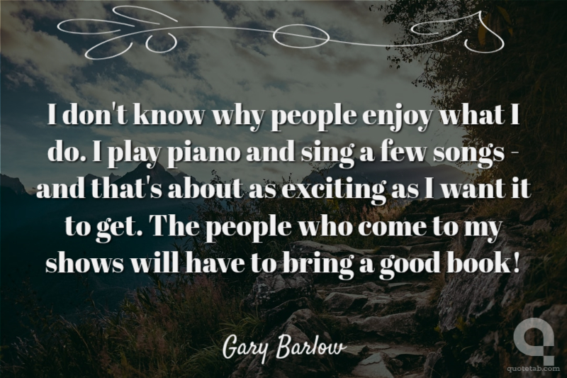 I don't know why people enjoy what I do. I play piano and sing a few songs - and that's about as exciting as I want it to get. The people who come to my shows will have to bring a good book!
