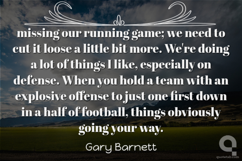 missing our running game; we need to cut it loose a little bit more. We're doing a lot of things I like, especially on defense. When you hold a team with an explosive offense to just one first down in a half of football, things obviously going your way.
