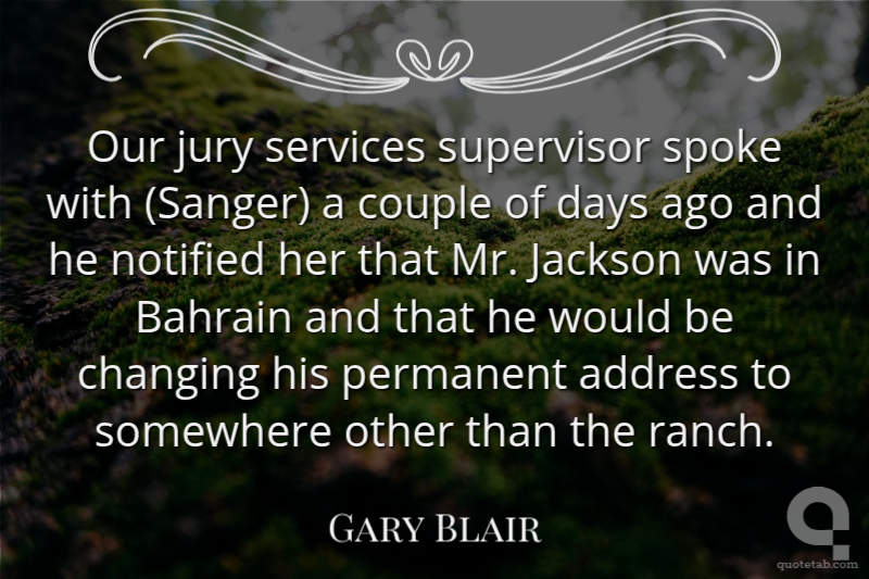 Our jury services supervisor spoke with (Sanger) a couple of days ago and he notified her that Mr. Jackson was in Bahrain and that he would be changing his permanent address to somewhere other than the ranch.