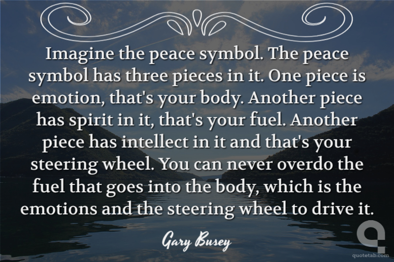 Imagine the peace symbol. The peace symbol has three pieces in it. One piece is emotion, that's your body. Another piece has spirit in it, that's your fuel. Another piece has intellect in it and that's your steering wheel. You can never overdo the fuel that goes into the body, which is the emotions and the steering wheel to drive it.